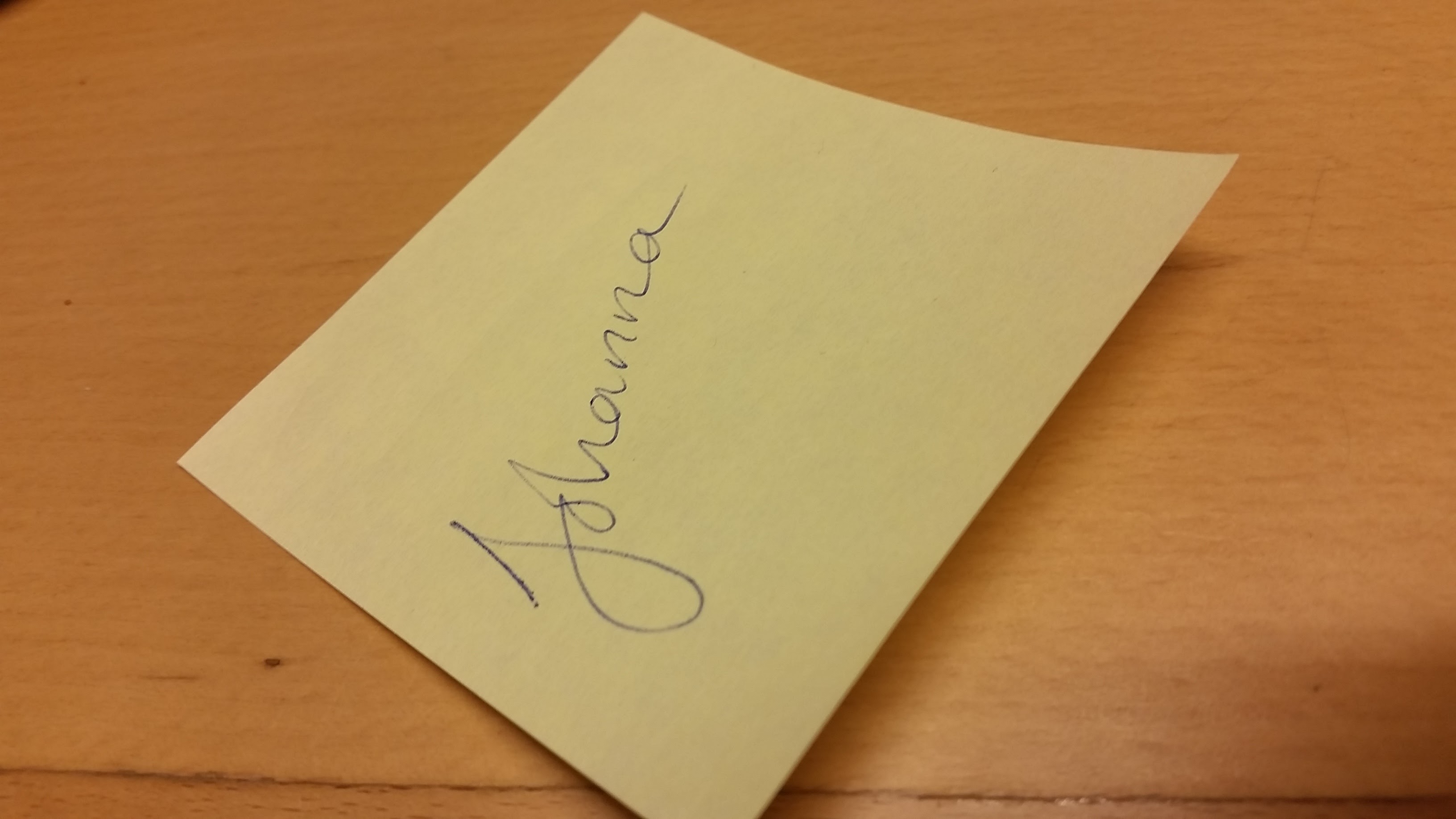 kr 20Vill du ha en personlig lapp? Varför inte en post-it? Till det extremt överkomliga priset av 20 kronor får du en personlig, handskriven post-it med valfri text. Bilden visar exempeltexten "Johanna". |